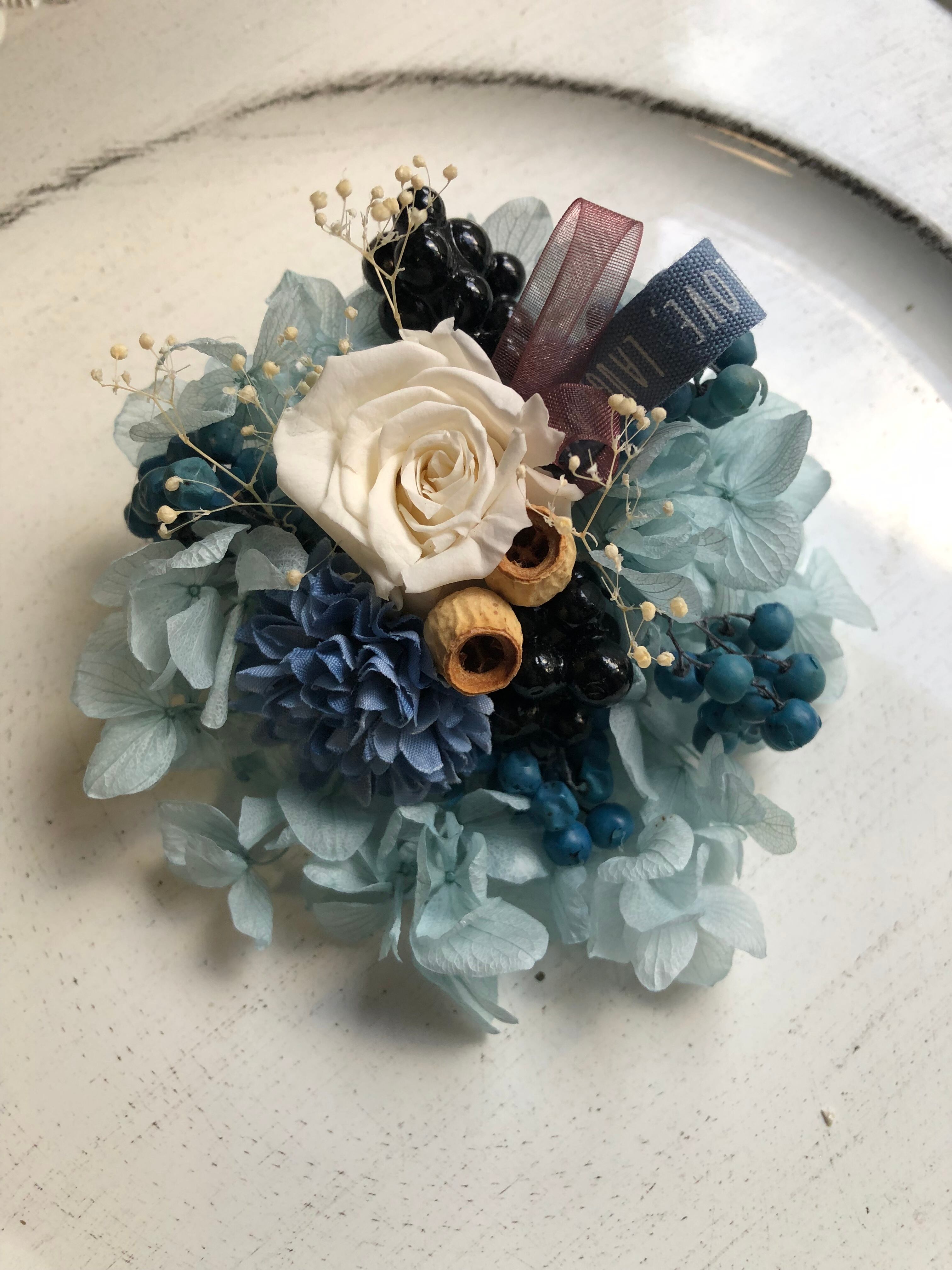 ブルー系のバラや紫陽花などを使用し作成しました。お洋服や鞄などにつけてもかわいいと思います。